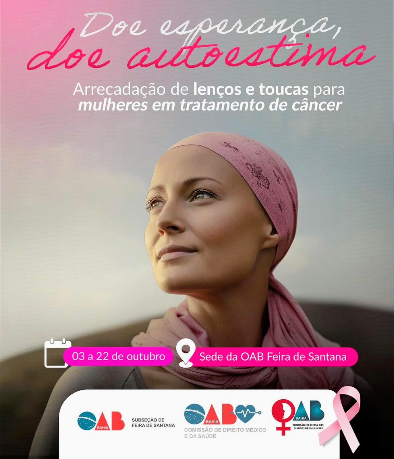 A campanha “Outubro Rosa” traz consigo a necessidade de cuidado com a saúde feminina para a prevenção e diagnóstico precoce do câncer de mama. Por isso, as comissões em Defesa dos Direitos das Mulheres e de Direito Médico da OAB Subseção Feira de Santana estão realizando uma campanha para arrecadação de doações de lenços e toucas para mulheres que estão em tratamento com o câncer de mama.