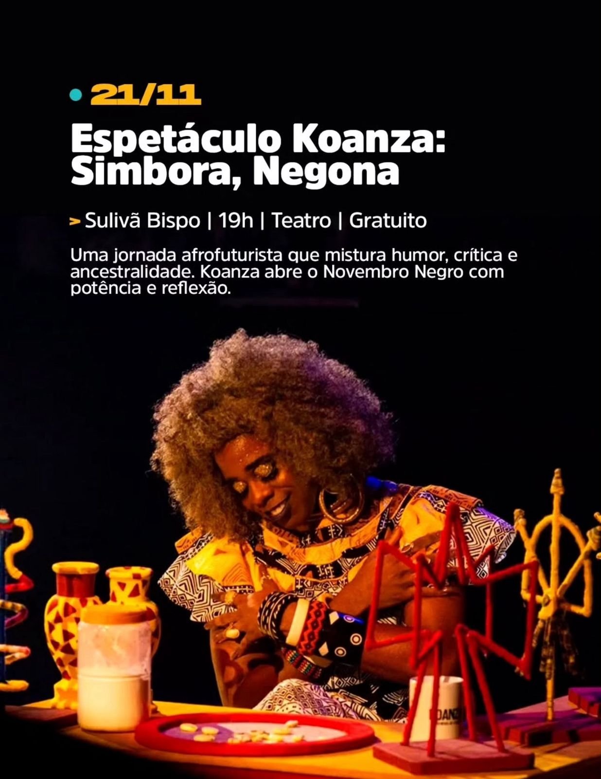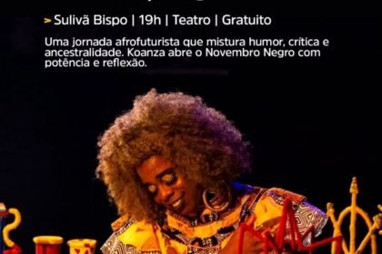 Nesta sexta, 21 de novembro, o Teatro do Centro de Convenções recebe o espetáculo “Koanza: Simbora, Negona”, com Sulivã Bispo, às 19h. Os ingressos são gratuitos e podem ser retirados no Sympla: https://www.sympla.com.br/evento/vem-viver-o-novembro-negro-21-11-2025-espetaculo-koanza-simbora-negona-ator-suliva-bispo/3225278