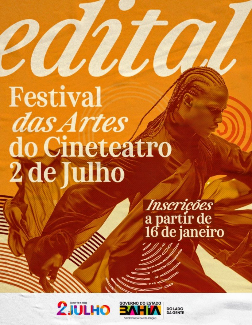 O IRDEB abre inscrições para o I Festival das Artes do Cineteatro 2 de Julho, iniciativa inédita que promove cultura, diversidade e acesso democrático às artes. O evento acontece em abril de 2026, no Cineteatro 2 de Julho, em Salvador, com até 16 ações culturais em música, teatro, dança, cinema, fóruns, palestras, workshops e lançamento de filme inédito. A expectativa é atingir mais de 2.500 pessoas, incluindo 1.000 estudantes da rede pública estadual. Com foco na arte negra, o evento valoriza produções afro-brasileiras e o protagonismo de artistas negros. As inscrições são gratuitas, de 16 de janeiro a 06 de fevereiro de 2026, pelo formulário: https://forms.office.com/r/wNfQcay5J0.