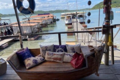 O Restaurante “El Capitan” fica na enseada à beira mar onde existem mais dois outros restaurantes o “São Roque” e o “Pier Sun” – são praticamente geminados – todos com ancoradouros para lanchas e jet-skis – o que eles chamam de pequenas ilhas. O local do “El Capitan” se chama “Ilha do Capitão” e tem, nos pareceu, o mais largo ancoradouro o que permite atracar uma escuna como a nossa.