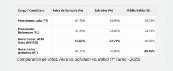 Divergência estadual: Em 2006, 2010, 2014 e 2022, Feira de Santana deu vitória ao candidato da oposição (Paulo Souto/ACM Neto) para o governo, enquanto o PT (Jaques Wagner/Rui Costa/Jerônimo Rodrigues) venceu no estado.