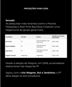 Senado: As pesquisas mais recentes (como a Paraná Pesquisas e Real Time Big Data) mostram uma hegemonia do grupo governista: