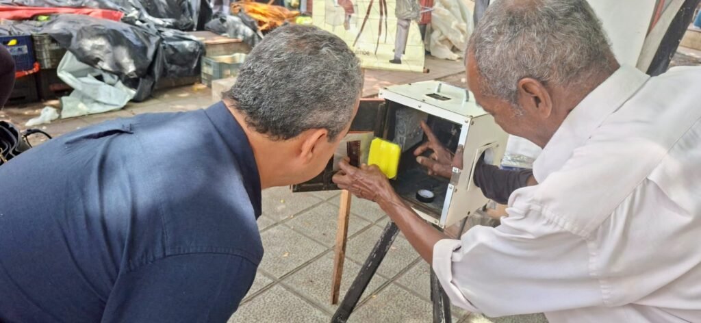 ZA: Ó, já houve três mudanças. A primeira a gente ficou ao redor da praça. Aí teve a reconstrução da praça e tal, tudo bem. A segunda, antes da pandemia um bom tempo, a gente ficou do lado do Mercado de Arte. E a terceira foi que o Prefeito decidiu que ia dar certo lá no Shopping Popular, mas infelizmente deu negativo pra nossa área de fotógrafo lambe-lambe. Porque realmente foi boa a tentativa mas, na minha concepção e da maioria, a foto lambe-lambe, 3×4, só tem respaldo na praça. E lá não deu certo, uns abandonaram, como eu, e outros aqui… não deu, a gente não tinha condições de pagar um preço alto lá, que chegava a custar 400 e alguma coisa. E a gente não tinha condições. Aí foi o jeito abandonar e vir resistir aqui novamente tentar resgatar essa cultura tão valiosa de Feira de Santana que é o lambe-lambe.