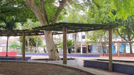 CARAMANCHÃO PELADO – Esses caramanchões, da praça da Kalilândia, têm mais de uma década. Mas nenhuma trepadeira cresceu enlaçada em seus troncos para formar sombra e embelezar o ambiente. {[Construção rústica, de ripas ou estacas, geralmente recoberta de planta trepadeira, situada num parque ou jardim; camaranchão}] Mas há a sombra das árvores…são caramanchões sem função